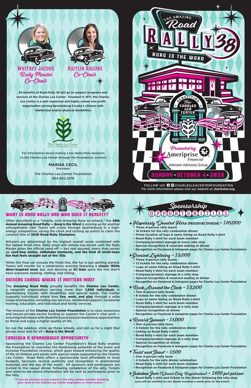 Often described as a “scavenger hunt in a car,” Road Rally benefits the Charles Lea Center, a non-profit that supports over 1, 500 individuals in Spartanburg County with disabilities and special needs. For more information click here to view the brochure.